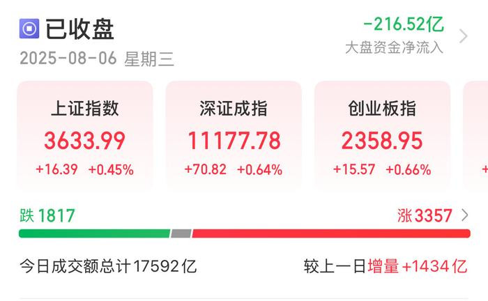 8月6日,A股三大指数集体上涨,沪指再创年内收盘新高。截至收盘,沪指涨0.45%,收报3633.99点;深成指涨0.64%,收报11177.78点;创业板指涨0.66%,收报2358.95点。全市场成交额达17592亿元,较昨日放量逾千亿。全市场超3300只个股上涨。两融余额水涨船高,最新数据突破2万亿元,为2015年7月以来首度重返2万亿元。