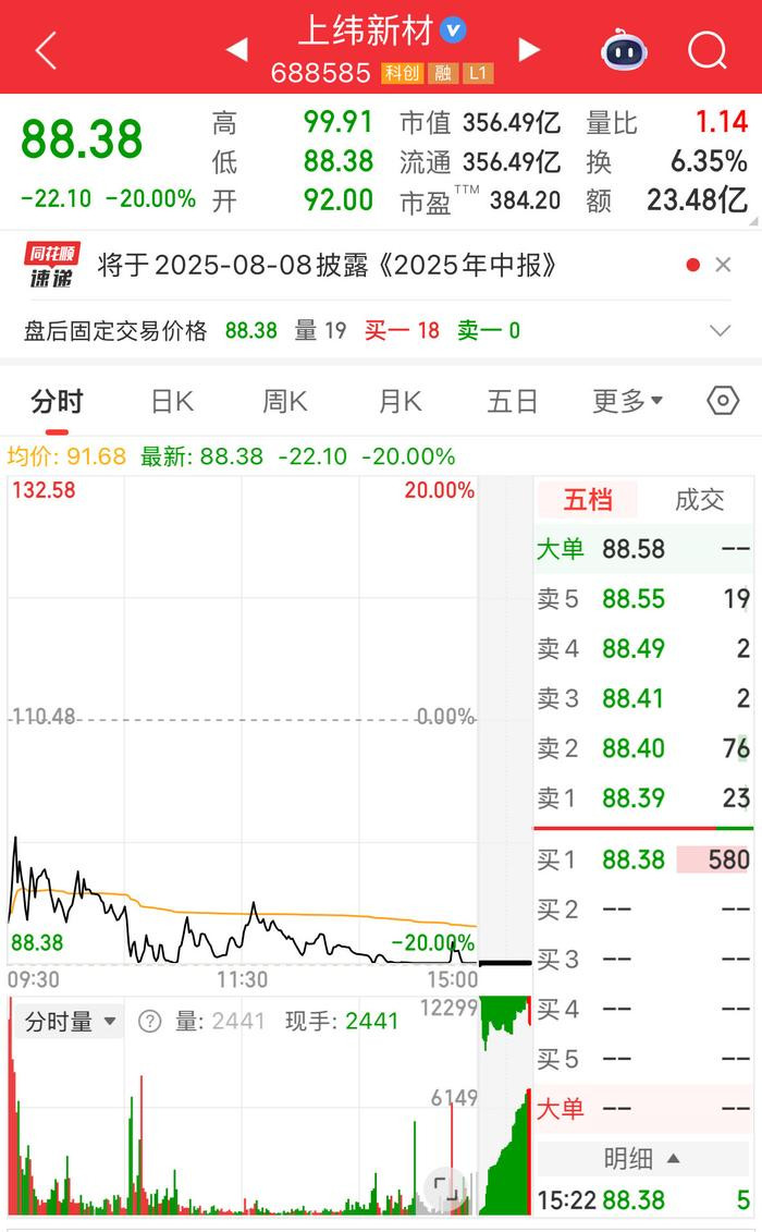 此外,自7月9日以来创造了13个涨停板神话的上纬新材,今日跌落“神坛”,股价狂跌20%,收报88.38元。